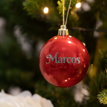 Bola de plástico decorativa en colores rojo o dorado con el nombre personalizado de la familia, amigos.... Idial para colocar en el árbol de Navidad y dar un toque personal y clásico al hogar.
