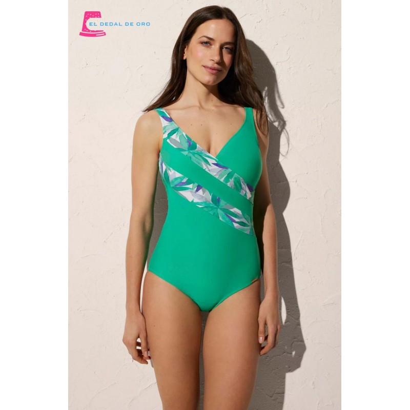 Swimwear Collection. Bañador reductor efecto vientre plano que moldea el cuerpo y estiliza la figura. Liso con rayas que cruzan en un estampado tropical. Moldea y estiliza la figura. Parte superior con relleno.